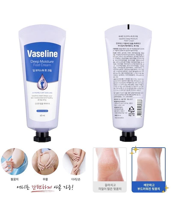 - Vaseline deep moisture foot cream. Helps to provides gentle care to the skin. Maintains moisturizing and nutrients to the dry and rough feet and leaves them smooth, healthy and moisturized all day long.